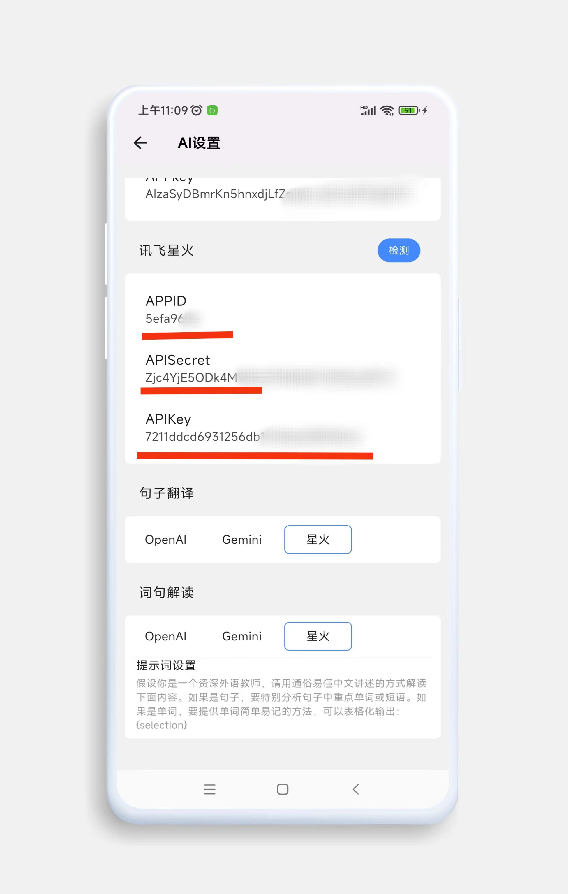 在分句翻译APP,将AppID、API Key和API Secret填入AI设置里面"星火"设置中。